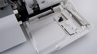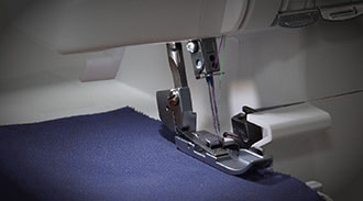 Just slide the needle plate setting knob to the "R" position to switch the stitch finger for rolled hemming.