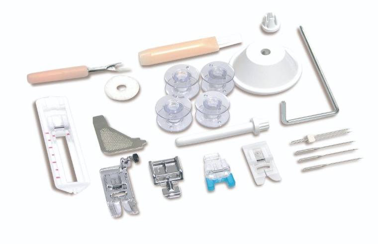 | Edge / quilting guide Bobbin (4x) Spool holders Auxiliary spool pin Spool pin felt L-screwdriver Seam ripper / brush Soft cover Extension table |